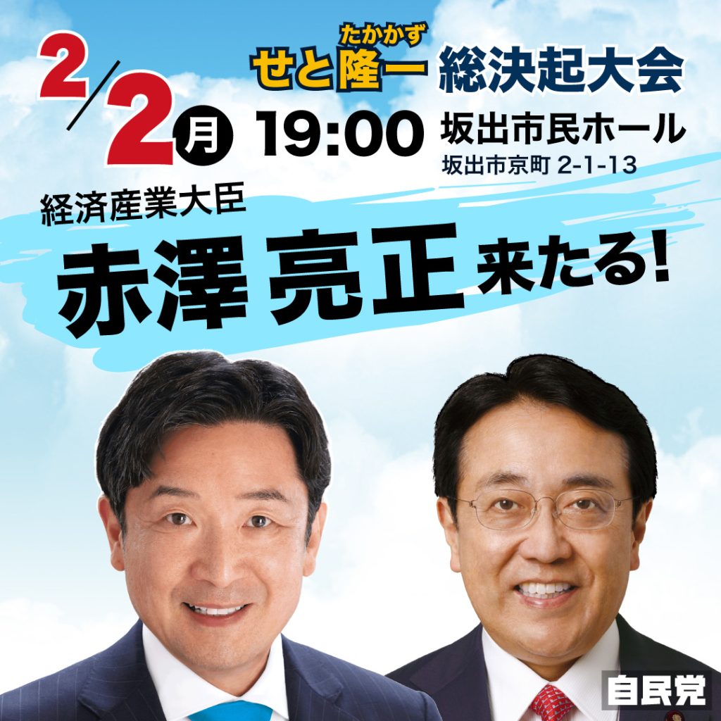 当日は、赤澤亮正 経済産業大臣に応援にお越しいただきます。